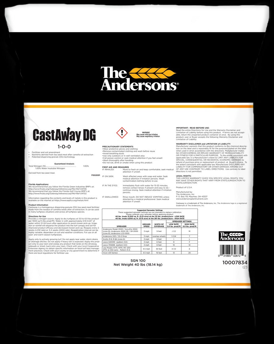 The Andersons CastAway DG 1-0-0 is a natural, high-protein fertilizer made from tea seed meal, specifically formulated to reduce worm castings on finely maintained turf. Ideal for golf courses, sports fields, and other high-visibility turf areas, CastAway DG works on all turfgrass types and is safe for both cool- and warm-season grasses.
