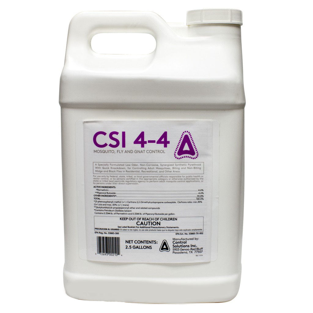 CSI 4-4 Mosquito, Fly & Gnat Control is a professional-grade solution for fast knockdown and control of common flying pests, including mosquitoes, gnats, and flies. Formulated with permethrin and piperonyl butoxide (PBO), this concentrate delivers proven results when applied through ULV cold foggers, thermal foggers, or barrier misting equipment. It can be applied undiluted or diluted with mineral oil, giving flexibility for ground or aerial treatments.