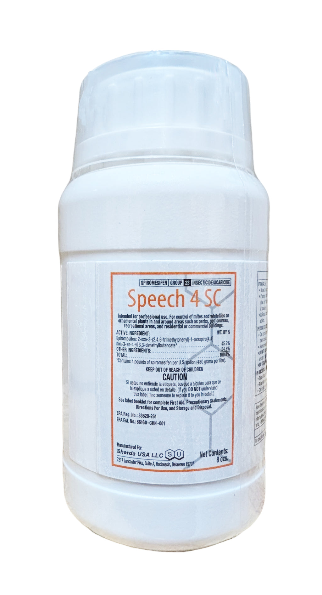 Speech 4 SC is the generic equivalent of Forbid 4F, delivering outstanding knockdown and long-lasting residual control of mites and all stages of whiteflies for up to eight weeks. With its unique mode of action, Speech 4 SC provides exceptional control of pest populations resistant to conventional products. Applied as a foliar spray, it penetrates leaf tissue with excellent translaminar movement for complete, lasting protection while maintaining minimal impact on beneficial insects when used according to label directions.