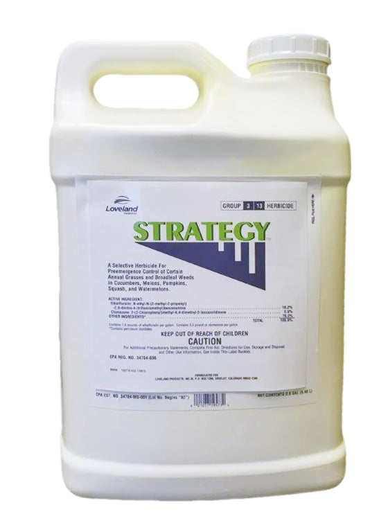 Strategy Herbicide is a selective, pre-emergence herbicide designed to control certain annual grasses and broadleaf weeds in cucumbers, melons, pumpkins, squash, and watermelons. It works by targeting weeds at germination, offering early-season control to help crops thrive. While Strategy is highly effective, it is known to clog filters due to its inert ingredients, which may form lumps. This does not affect performance, but filtering before tank mixing is strongly recommended.