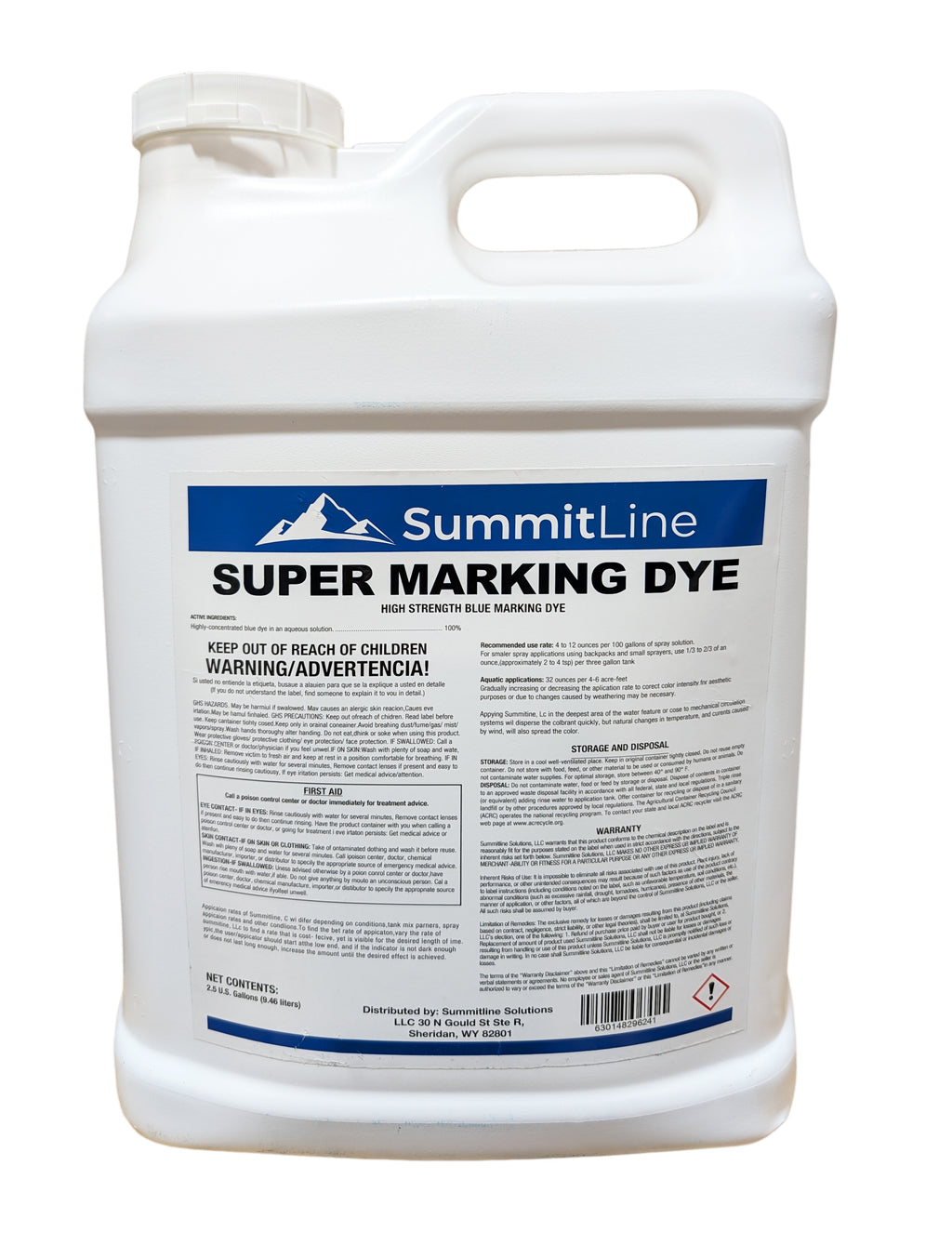 Summitline Super Marking Dye is a highly concentrated, premium-quality blue colorant formulated to clearly mark sprayed areas for precise pesticide or fertilizer applications. Designed for superior visibility, it ensures accurate coverage, reduces overspray, and improves applicator safety.
